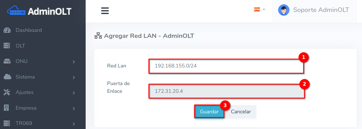 - Puerta de Enlace: IP VPN asignada por AdminOLT