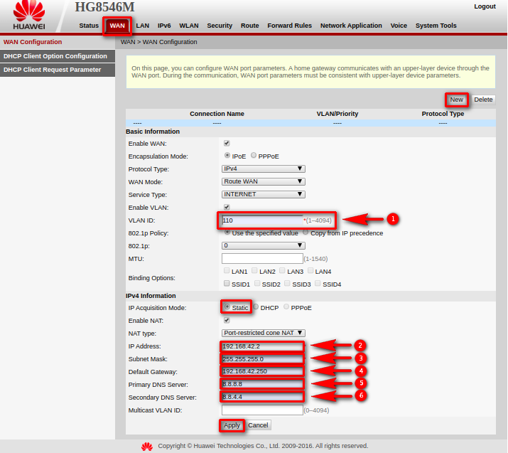 Entramos a la pestaña WAN, damos click en New, ponemos nuestra información