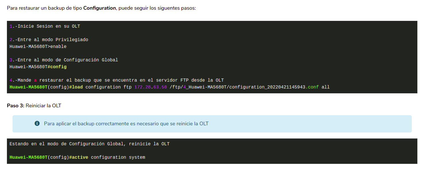 Como lo puede leer, la OLT necesita reiniciarse después de cada restauración, le recomendamos hacer esta acción con precaución