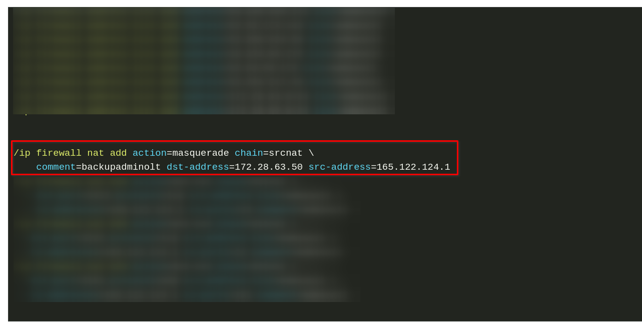 Entonces se generará un nuevo apartado, coloque la siguiente regla enmarcada en la terminal de su Routerboard