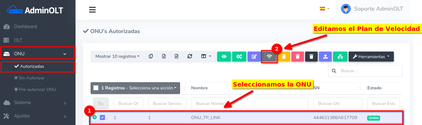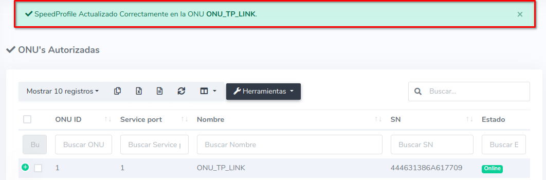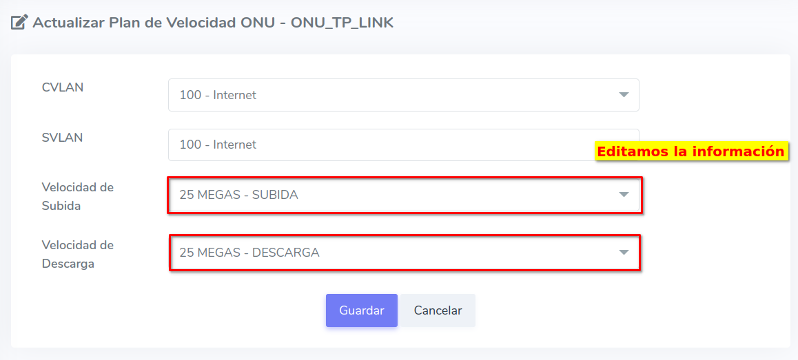Para este ejemplo usaremos una ONU Autorizada que inicialmente tiene un Plan de 100 Megas, en este caso nosotros lo cambiaremos a un Plan de 25 Megas.