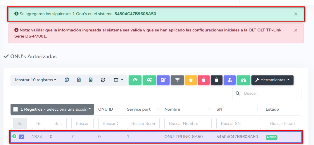 3Una vez que hayamos seleccionado los equipos, importamos las ONU's al sistema AdminOLT