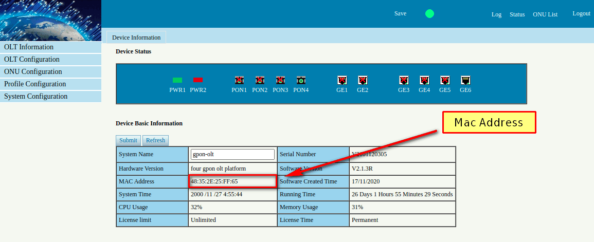 Para poder saber si mi OLT es WOLCK nos podemos guiar de la Mac Address del equipo, para saber la Mac hay 2 formas una que es desde la interfaz web de la OLT y la otra es por medio de la etiqueta que trae pegada nuestro equipo.