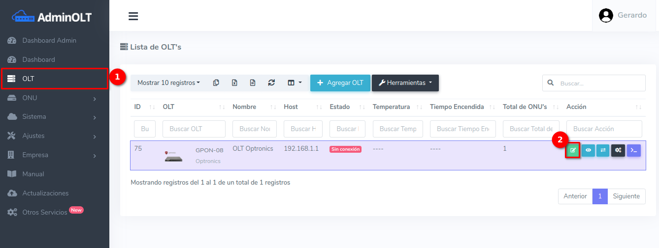 1 En la Lista de OLT's seleccionamos el equipo que deseamos conectar. La OLT ya debe estar registrada en AdminOLT.