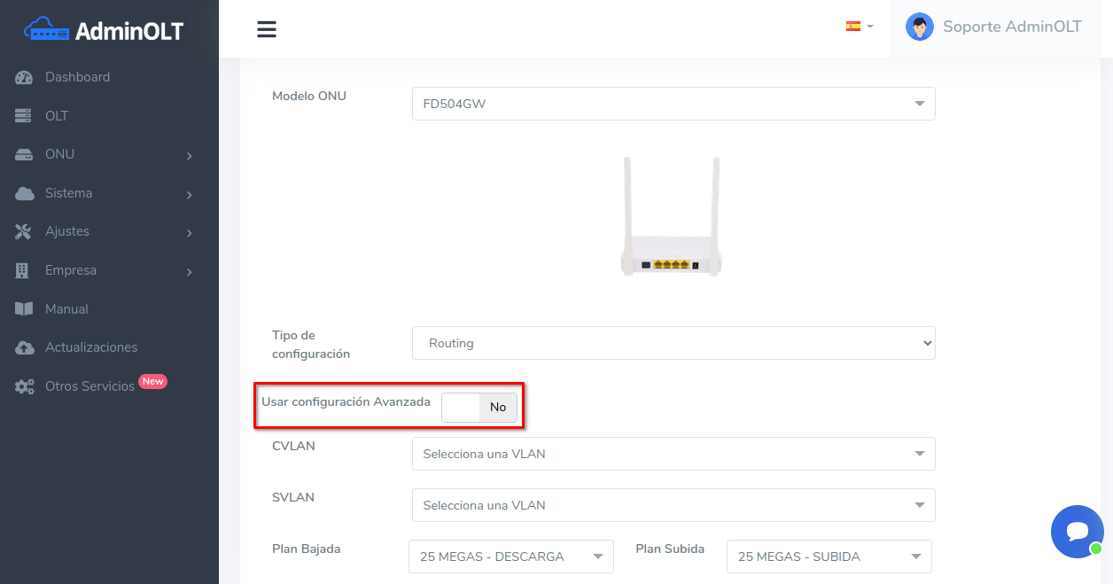 Una vez autorizada la ONU podrán modificar sus planes de velocidad y vlans asociados a los servicios desde la Lista de planes de velocidad.