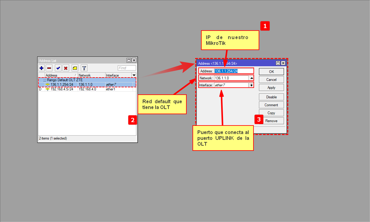 - 1.- Agregamos el segmento default de la OLT: 136.1.1.254/24 para que el Mikrotik tenga comunicación con la OLT