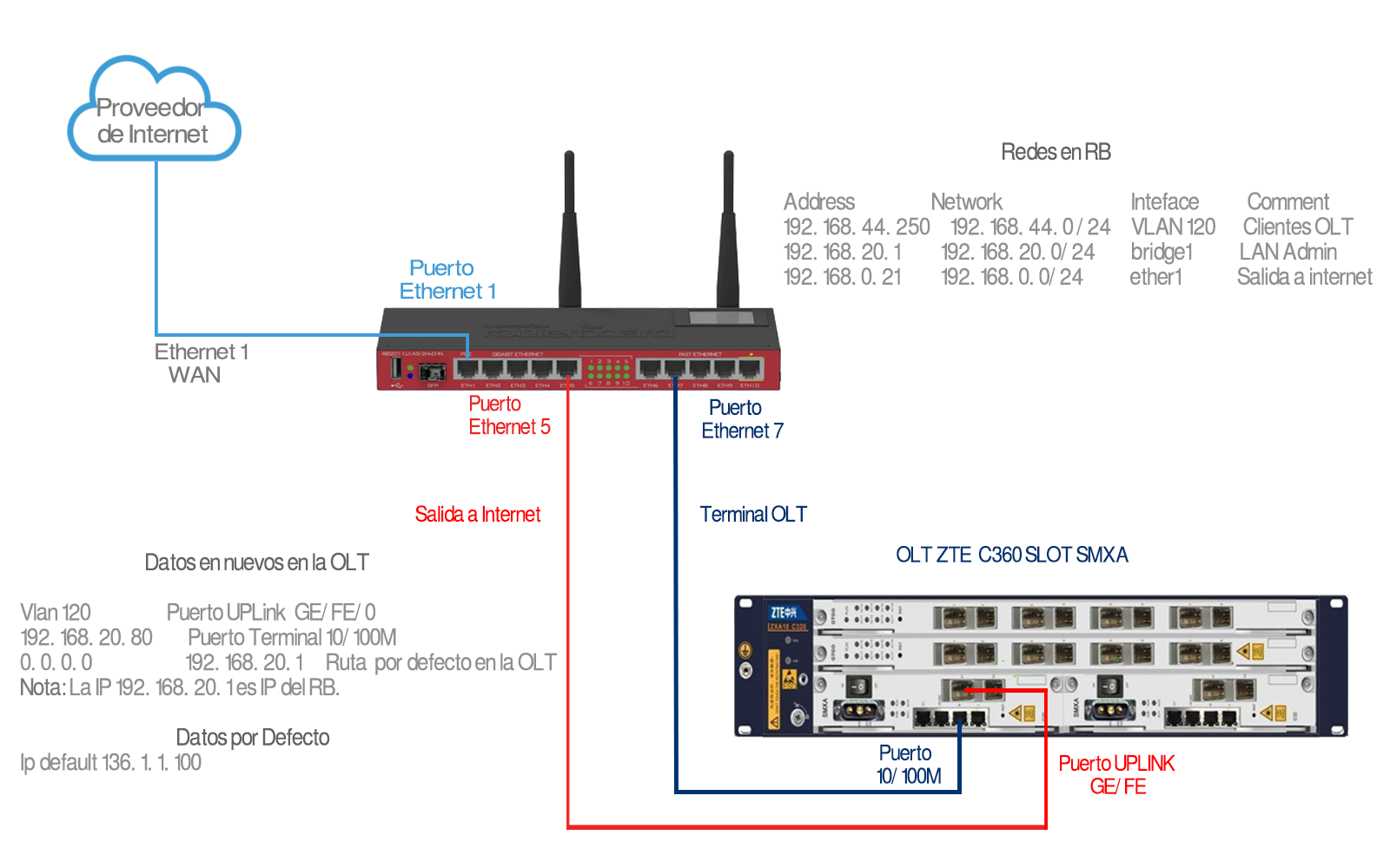 1.1Direccionamiento para la red default de Administración. Esta es la red que viene en las OLT ZTE nuevas o que se restablecieron a los valores por defecto. Esta IP solamente nos servirá para conectarnos por primera vez al equipo, ya que posteriormente en la configuración de la OLT vamos a cambiar la por nuestra red de administración.