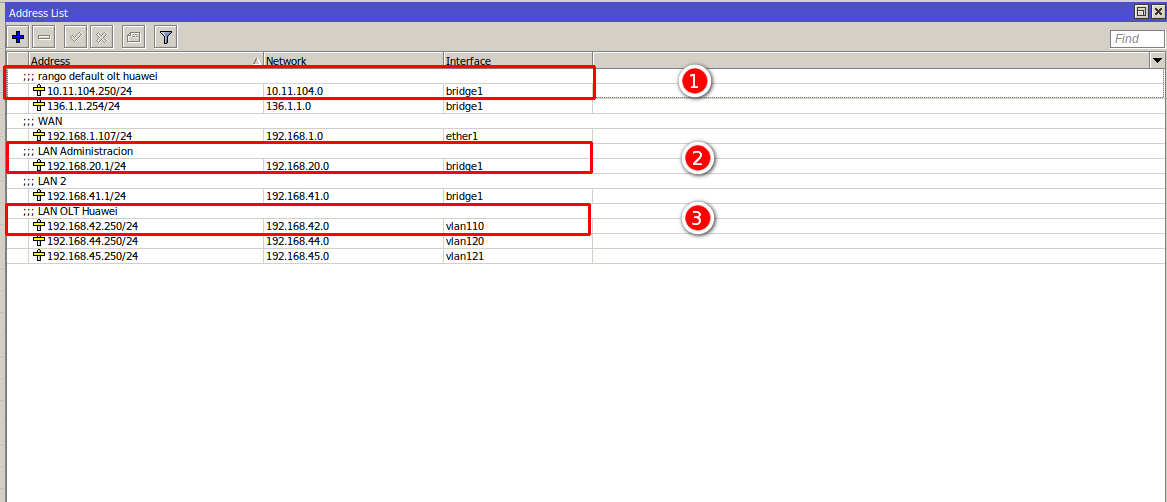 - 1.- Agregamos el segmento default de la OLT: 10.11.104.0/24 para que el mikrotik tenga comunicacion con la OLT