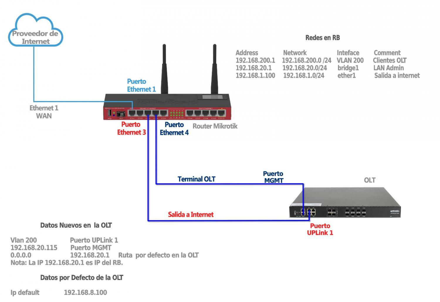 Para tener más clara como se estructura la conexión de la OLT al momento de realizar la configuración, puede apoyarse del siguiente diagrama, sobre como realizar la conexión física.