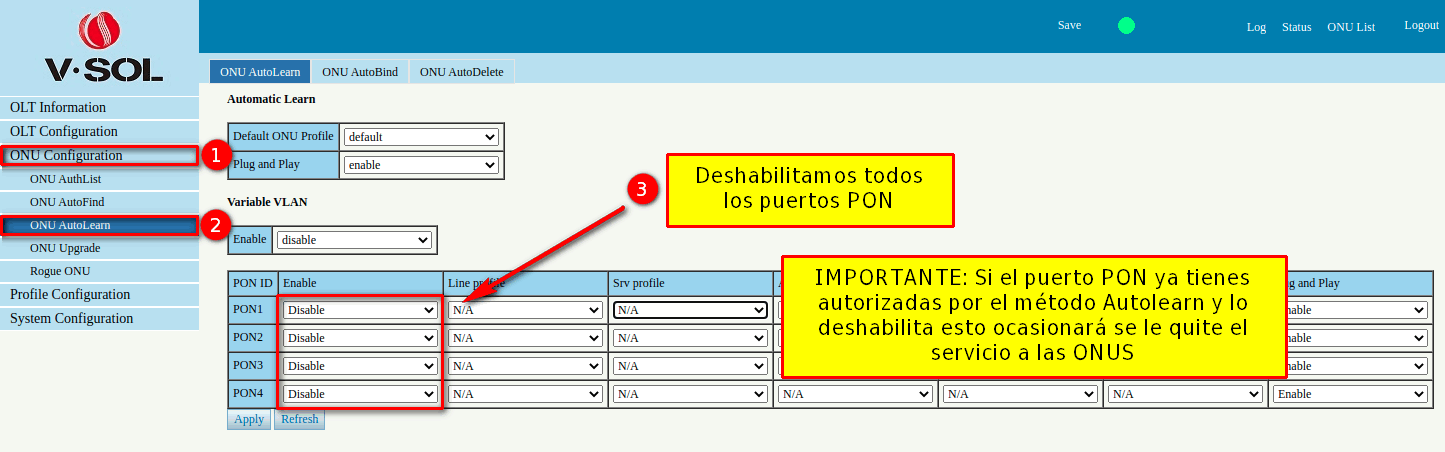 1 Entramos a la interfaz web de nuestra OLT e iniciamos sesion y deshabilitamos el modo AutoLearn