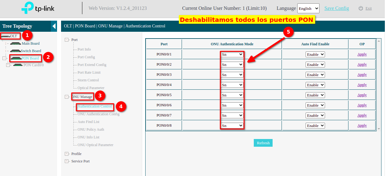 3 Modificamos el Modo de Autentificación del puerto PON