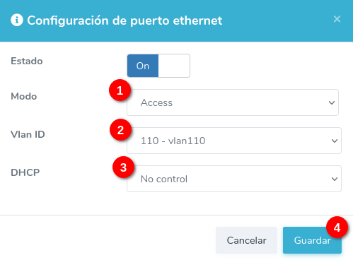 Coloque la opción modo en Access, coloque una vlan en la opcion Vlan ID, seleccione el tipo de DHCP y guarde el cambio