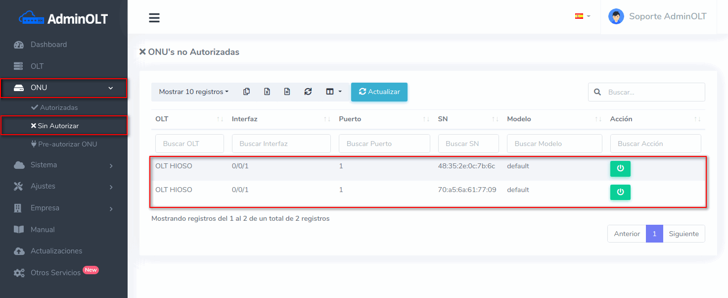 En caso de que la opción de SN Disponibles no le muestre resultados, a pesar de tener Onus de la misma marca de la OLT en la lista de ONUs no Autorizadas, presione el botón que se encuentra en el cuadro azul, lo llevara a la lista de ONUs No Autorizadas.