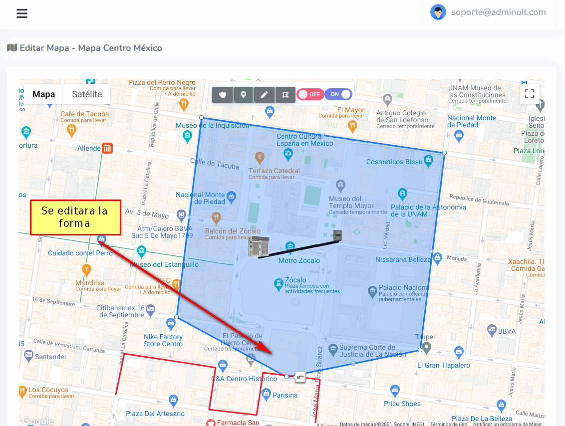 Una vez haya dibujado la Geozona que desea, para terminar de dibujar debemos dar click en la opción de Manipular Mapa.