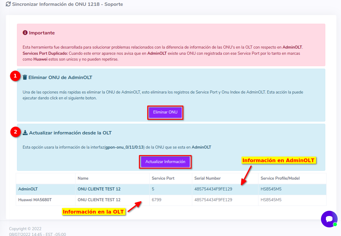2.- Sincronizar la información de la onu en AdminOLT con la información de la OLT: Esta acción va a actualizar el service port a partir de la información que se halle en la interfaz que se obtenga