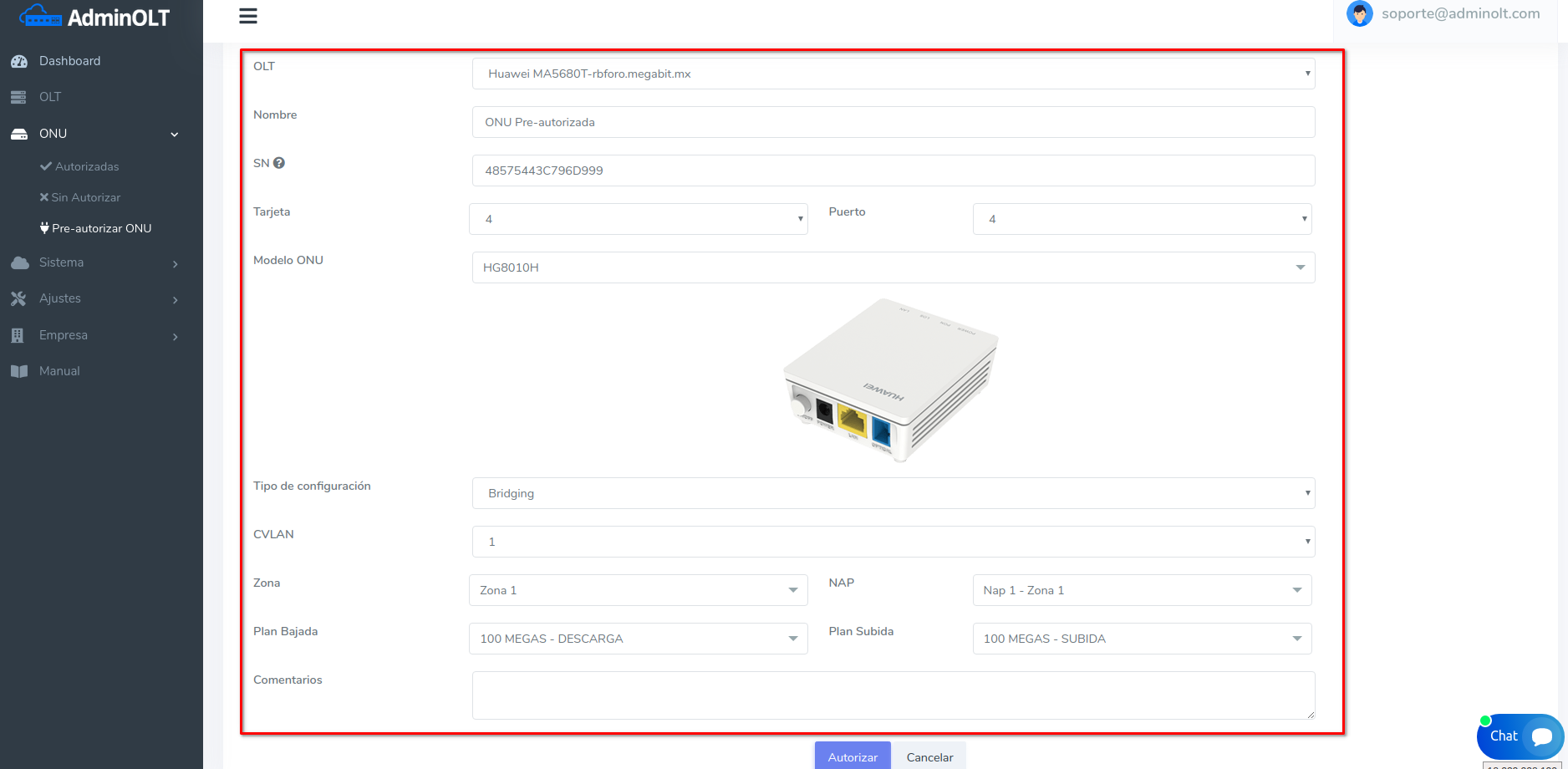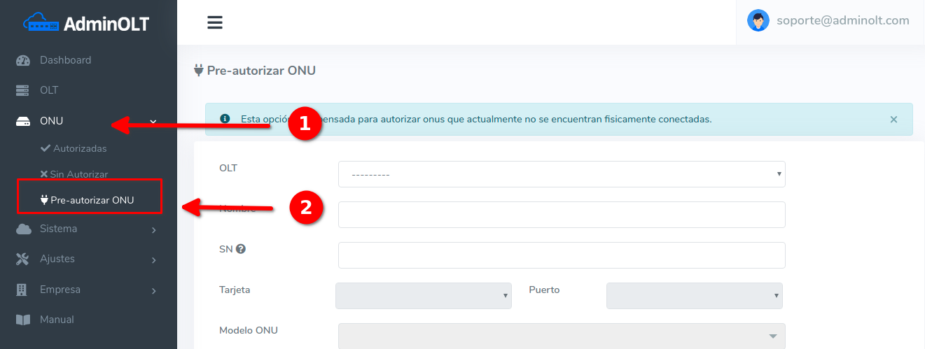 El pre-autorizar una ONU en el sistema, es básicamente autorizar el Numero de Serie (SN) de una ONU que no está conectada físicamente. De esta forma al momento de instalación, solo debe conectarse el equipo.