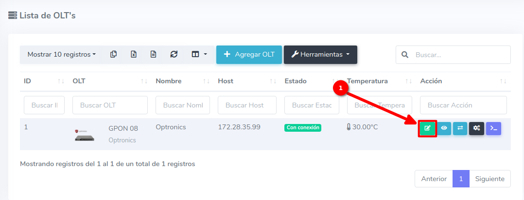 1 Para poder establecer la conexión de manera exitosa es necesario que generemos un script, para poder generarlo, nos dirigimos a nuestra OLT y seleccionamos la opción de editar.